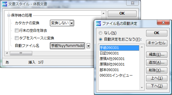「原稿090301」や「日記090301」などの任意文字列+日付の形式も使用できます。文書の種類に合った名前の作成が可能です。