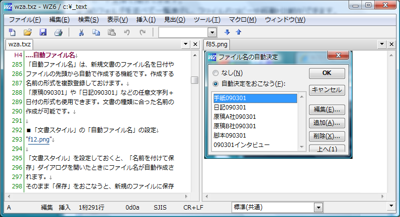 「自動ファイル名」は新規文書のファイル名を、日付やファイルの先頭から自動で作成する機能です。作成する名前の形式を複数登録しておけます。