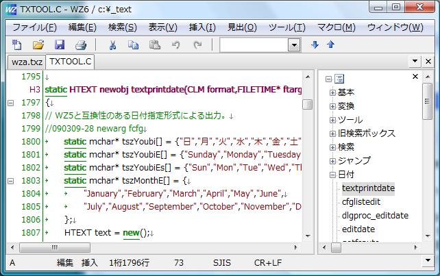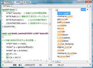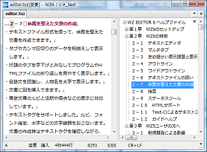 長い文書やプログラムを見通しよく作成できます。本文と目次を並べて編集作業ができます。